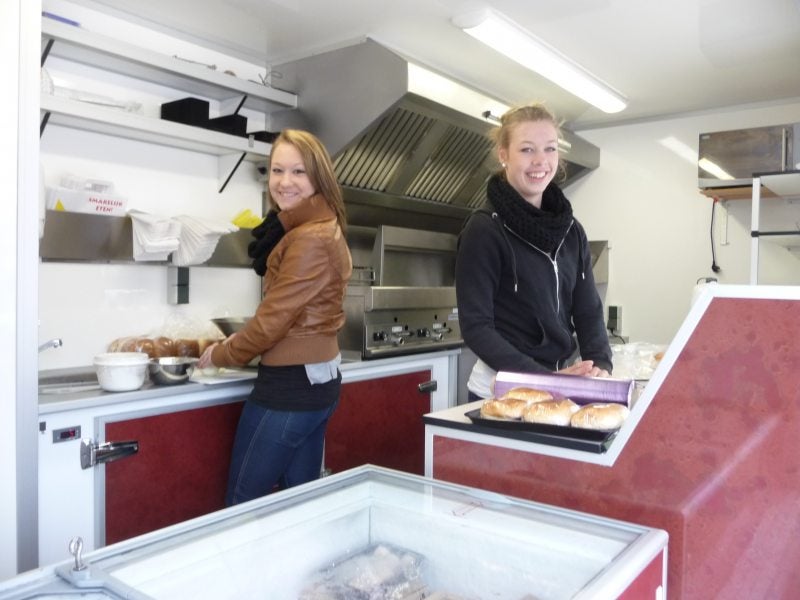 Rianne en Amber aan het werk in de frietkar van Jáco's friture.