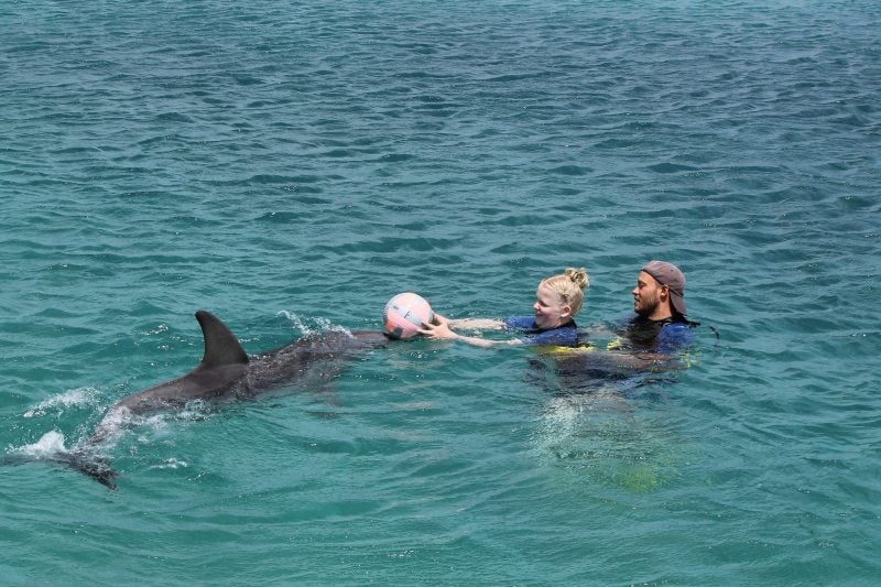 Nicolette gooit de bal weg waarna de dolfijn hem weer terug brengt