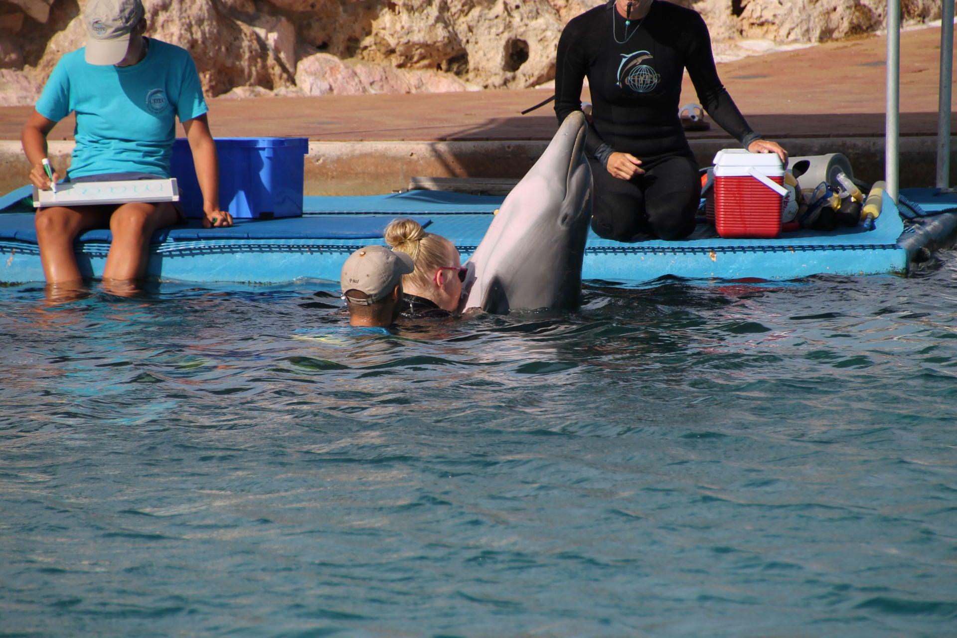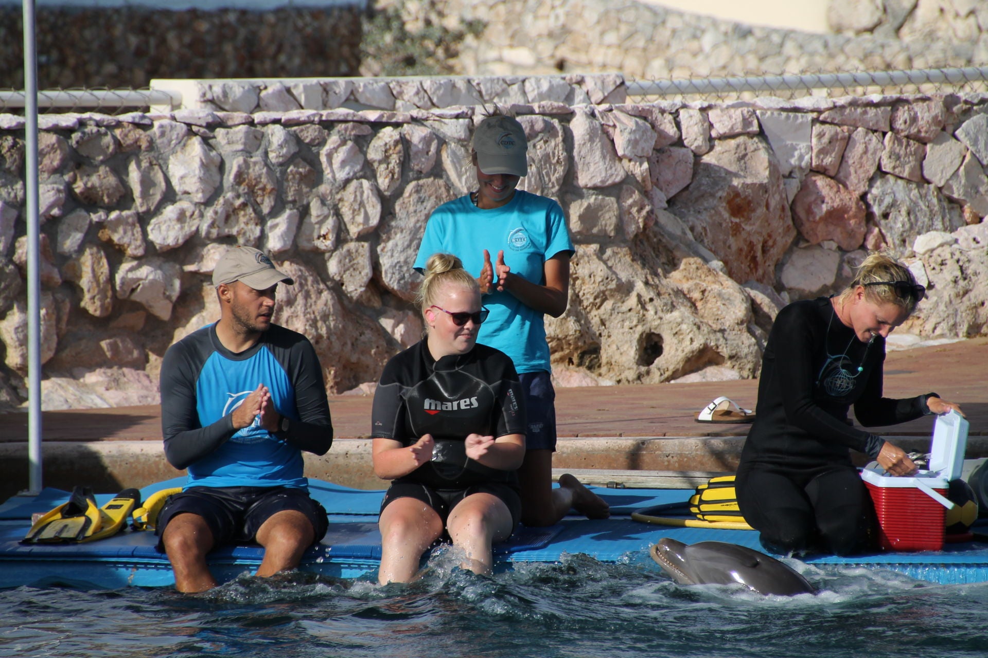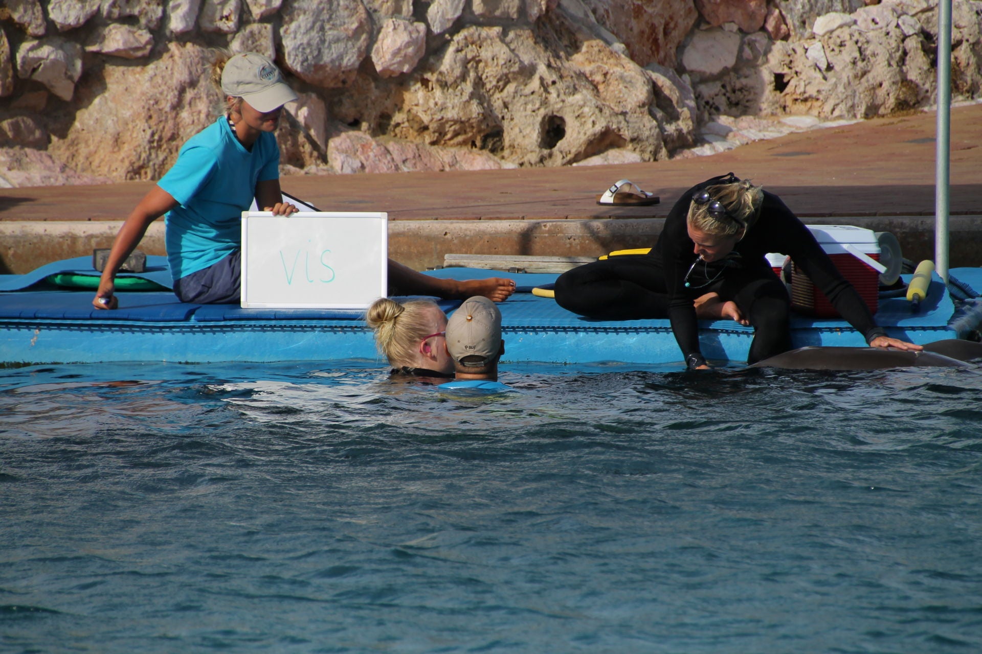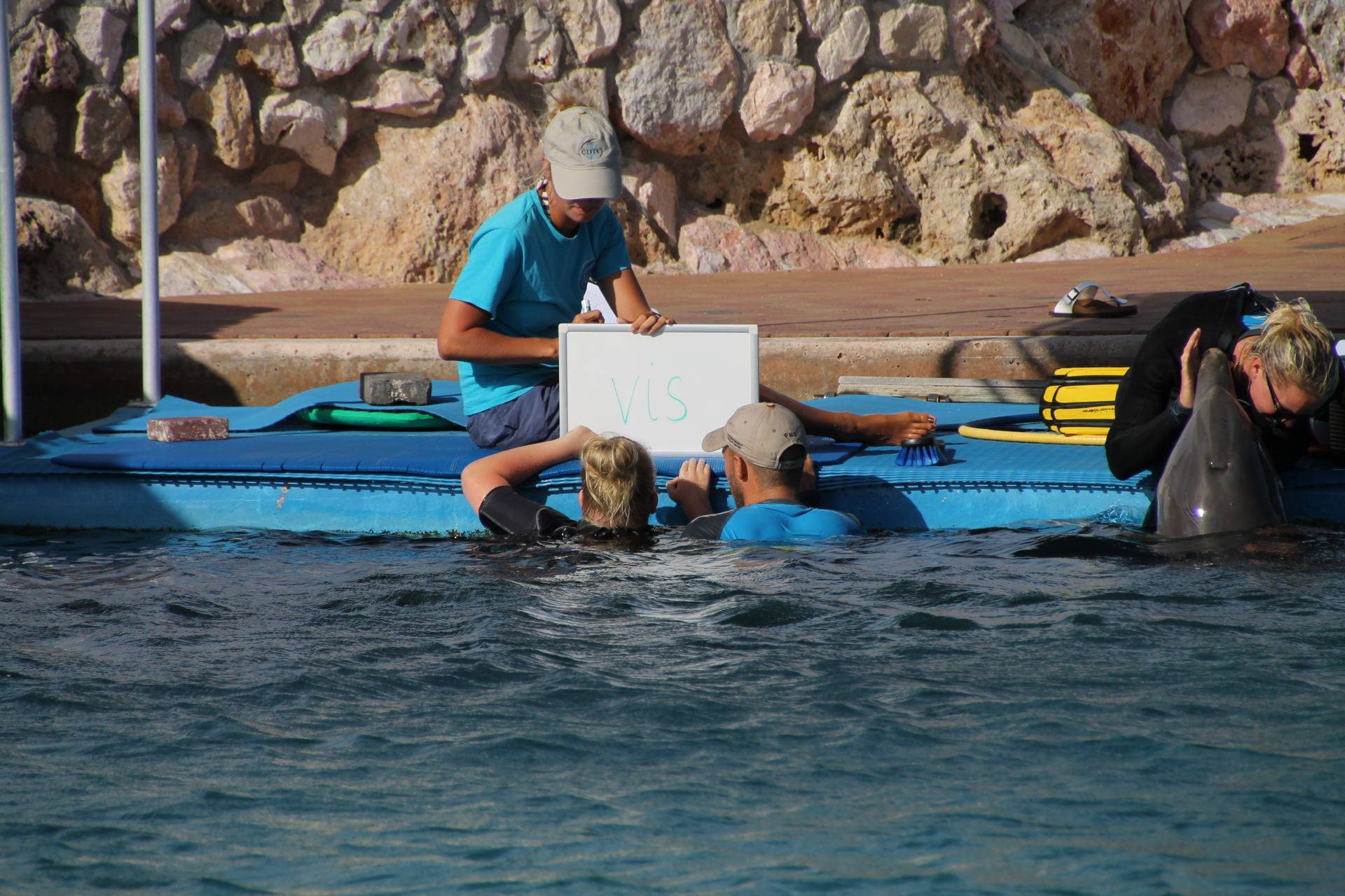 Nicolette moet aan de dolfijnentrainster vragen wat ze wil zien van de dolfijn
